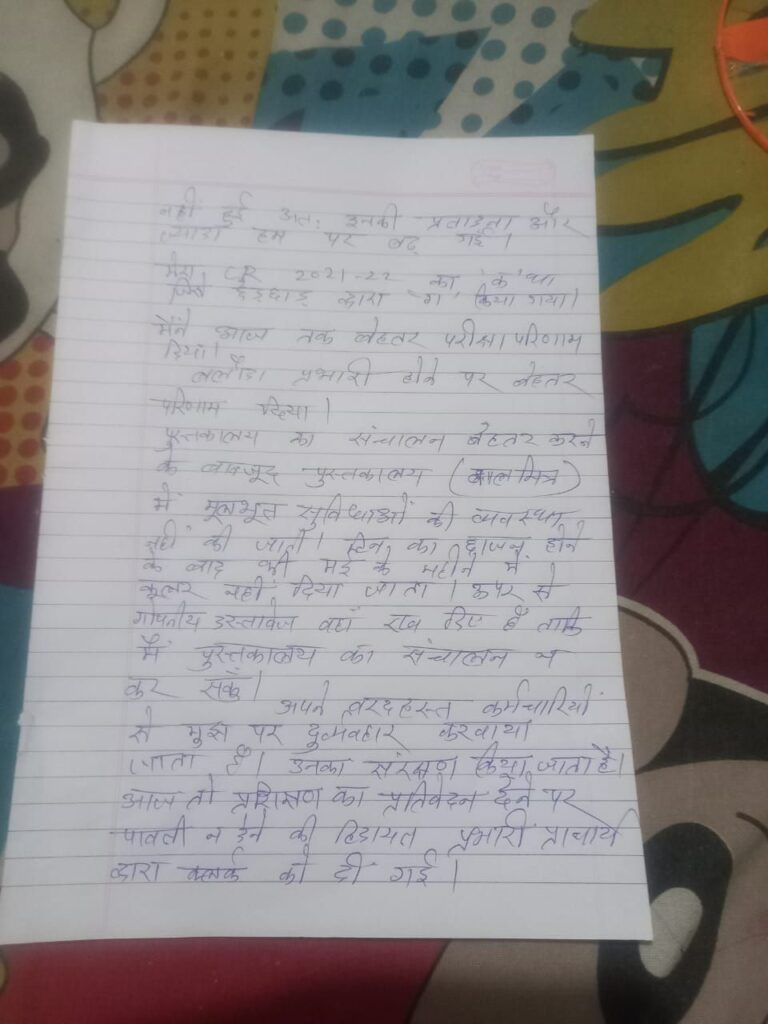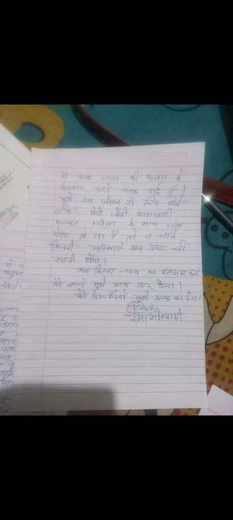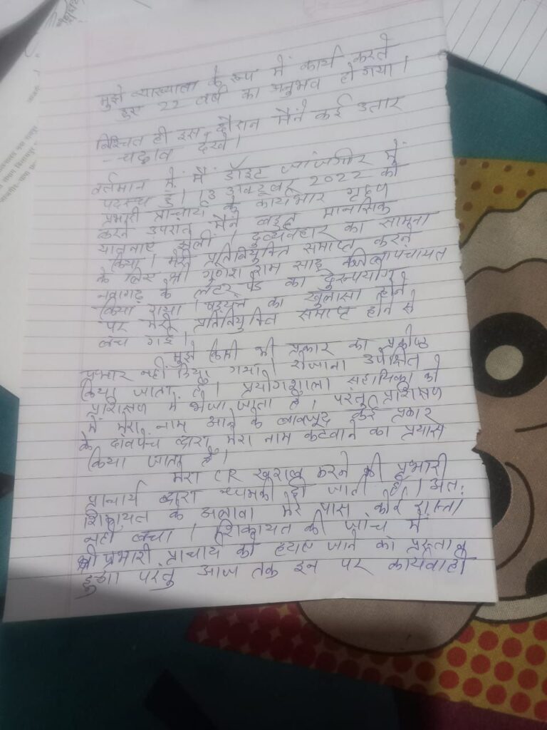 जांजगीर 11 जनवरी 2024। महिला व्याख्याता ने जहर खाकर आत्महत्या की कोशिश की है। मामला जांजगीर का है, जहां महिला व्याख्याता ने आत्महत्या से पहले एक सुसाइड नोट शिक्षकों के ग्रुप में डाला है, जिसमें प्राचार्य और दो अन्य सहकर्मियों पर प्रताड़ना का आरोप लगाया है। महिला की स्थिति डॉक्टर ने सामान्य और खतरे से बाहर बताई जा रही है। महिला व्याख्याता का नाम रामा गोस्वामी है, जो फिलहाल डाईट में पदस्थ हैं। अपने सुसाइड नोड में व्याख्याता ने पूरी कहानी बतायी है। तीन पन्ने के नोट मे व्याख्याता रामा गोस्वामी ने लिखा है कि वो 22 साल से स्कूल शिक्षा विभाग में पदस्थ है। वो पिछले दो साल से डाइट जांजगीर में पदस्थ है। आरोप हैकि जब से प्रभारी प्राचार्य की जिम्मेदारी यहां संभाली है, तभी से वो लगातार प्रताड़ित हो रहीह । पत्र में उन्होंने जिला पंचायत के जनप्रतिनिधि गणेश राम साहू के लेटरहेड का दुरुपयोग कर प्रताड़ित करने का आरोप लगाया है। उन्होंने आरोप लगाया है कि उन्हें किसी प्रकार का प्रभार नहीं दिया गाय है। प्रशिक्षण से नाम कटवाने, सीआर खराब करने का आरोप भी महिला व्याख्याता ने लगाया है। उन्होंने कहा है कि वो प्रताड़ना से इस कदर थक गयी है कि आत्महत्या को मजबूर हो गयी है। उन्होंने कहा कि वो न्याय की आस में थक चुकी है, इसलिए वो आत्महत्या जैसा कदम उठा रहीहै। महिला व्याख्याता ने आखिरी में लिखा है कि मेरे बच्चों मुझे माफ कर देना.. मेरे विद्यार्थयों मुझे माफ कर देना। महिला प्राचार्य का आरोप है कि कर्मचारियों से भी उन्हें प्रताड़ित और दुर्व्यवहार कराया जाता है। उन्होंने कहा है कि उनके नेतृत्व में हमेशा अच्छा परिणाम दिया गया, लेकन लाइब्रेरी से लेकर अन्य सुविधाएं उन्हें नहीं दी गयी।