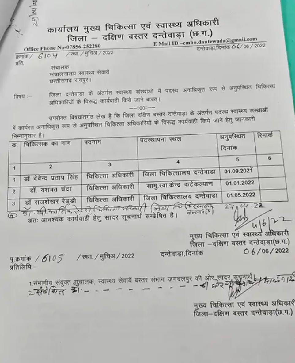लगातार 21 अगस्त 2021 से ड्यूटी से अनुपस्थित, CMHO व जिला अस्पताल ने 5 बार नोटिस जारी किया लेकिन कोई जवाब नहीं मिला।