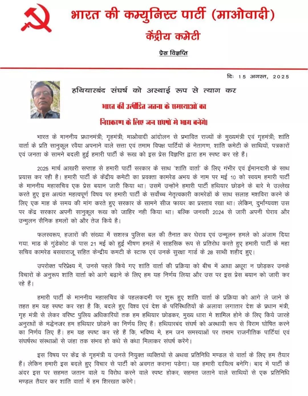 हमारी पार्टी के महासचिव के पहल कदमी पर शुरू हुए शांति वार्ता के प्रक्रिया को आगे ले जाने के तहत हम यह स्पष्ट कर रहे हैं कि बदले हुए विश्व और देश के परिस्थितियों के अलावा लगातार देश के प्रधानमंत्री, गृहमंत्री से लेकर वरिष्ठ पुलिस अधिकारियों तक हम हथियार छोडकर, मुख्य धारा में शामिल होने के लिए किए जा रहे अनुरोध के मद्देनजर हम हथियार छोड़ने का निर्णय लिए हैं। हथियारबंद संघर्ष पर अस्थायी रूप से विराम का निर्णय लिए हैं। हम यह स्पष्ट कर रहे हैं कि भविष्य में, हम जन समस्याओं पर तमाम राजनीतिक पार्टियां एवं संघर्षरत संस्थाओं से जहां तक संभव हो कंधे से कंधा मिलाकर करेंगे