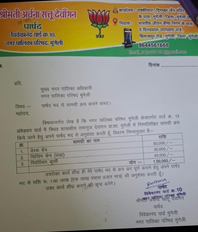 डेस्क बेंच – ₹80 हजार, सिलिंग फैन (पंखा) ₹40 हजार और रिवॉल्विंग कुर्सी – ₹30 हजार रुपए की सामग्री देने की बात कही। पत्र में स्पष्ट किया गया है कि उक्त सामग्री शीघ्र क्रय कर विद्यालय में स्थापित की जाए ताकि विद्यार्थियों को पढ़ाई के दौरान सुविधा मिल सके। नगर पालिका परिषद् मुंगेली की ओर से पार्षद निधि का यह सदुपयोग शिक्षा के क्षेत्र में सकारात्मक पहल के रूप में देखा जा रहा है। पार्षद श्रीमती अर्चना सत्तू देवांगन ने कहा कि “विद्यालय ही बच्चों का भविष्य गढ़ने का स्थान है। यदि उन्हें उचित संसाधन और वातावरण उपलब्ध कराया जाए तो वे निश्चित ही पढ़ाई में आगे बढ़ेंगे। इसी उद्देश्य से मैंने पार्षद मद से यह सहयोग करने का निर्णय लिया है।” स्थानीय नागरिकों और अभिभावकों ने भी पार्षद की इस पहल की सराहना की है। उनका कहना है कि आज के समय में विद्यालयों को बुनियादी सुविधाओं की सबसे ज्यादा आवश्यकता है और ऐसे प्रयासों से शिक्षा की गुणवत्ता में सुधार होगा। नगर पालिका परिषद् के अधिकारियों ने आश्वासन दिया है कि सामग्री क्रय कर शीघ्र ही विद्यालय में उपलब्ध कराई जाएगी। इस कदम से सैकड़ों विद्यार्थियों को प्रत्यक्ष लाभ मिलने की संभावना है। शिक्षा क्षेत्र में पार्षद निधि से किया जा रहा यह योगदान न केवल विद्यार्थियों बल्कि समाज के लिए भी प्रेरणादायी साबित होगा।