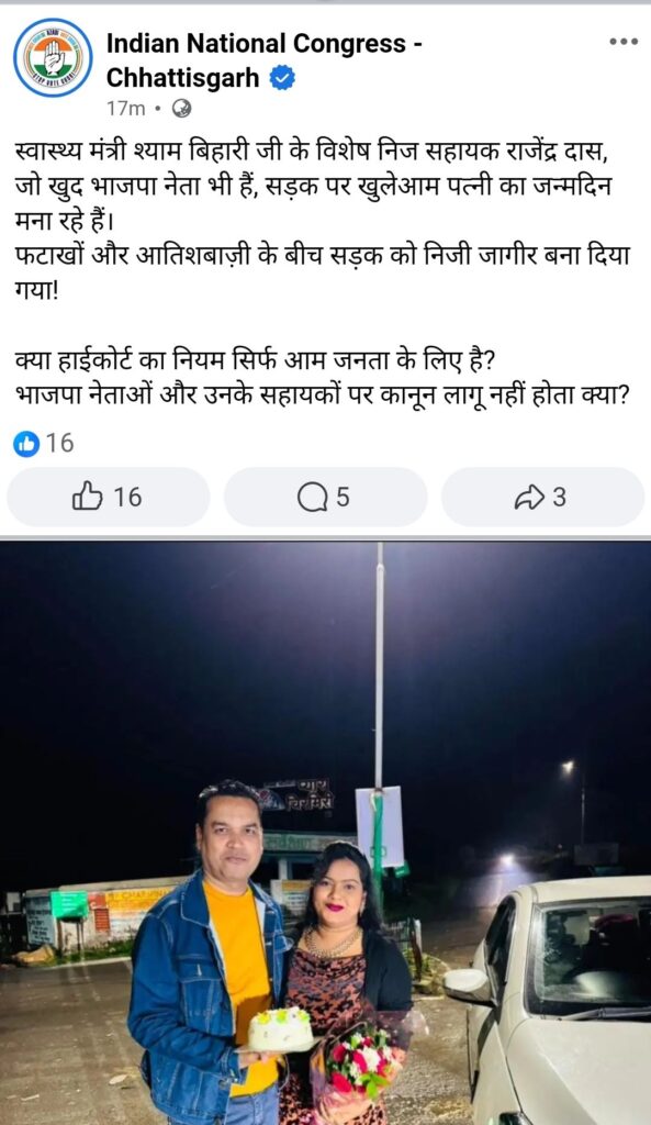 “स्वास्थ्य मंत्री श्याम बिहारी जी के विशेष निज सहायक राजेंद्र दास, जो खुद भाजपा नेता भी हैं, सड़क पर खुलेआम पत्नी का जन्मदिन मना रहे हैं।