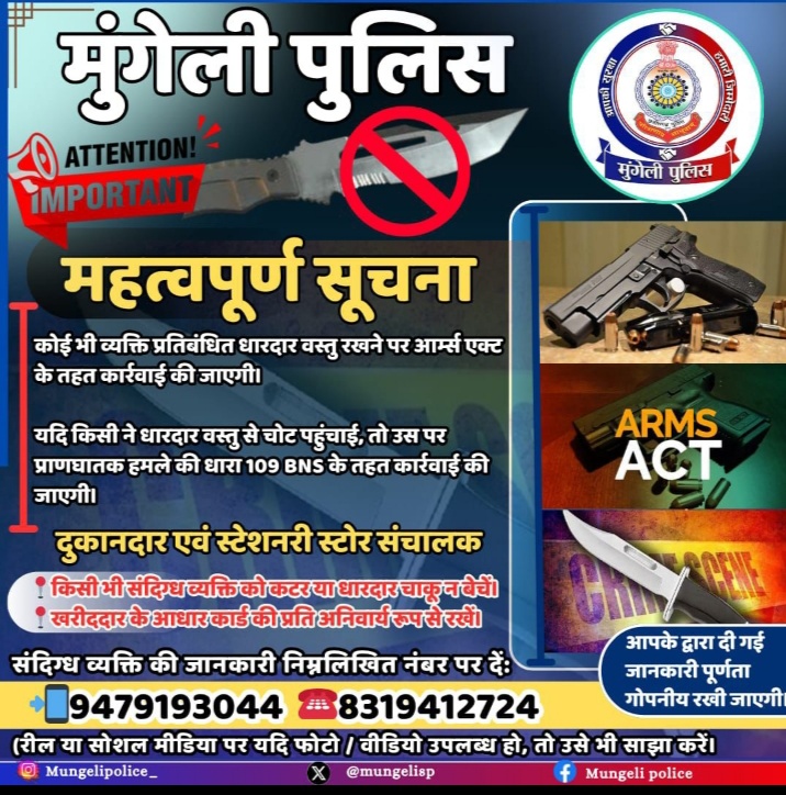 मुंगेली पुलिस आप सभी से अपील करती है कि किसी भी प्रकार की प्रतिबंधित धारदार वस्तु न रखें। ऐसा करने पर आर्म्स एक्ट के तहत कड़ी कार्रवाई की जाएगी।