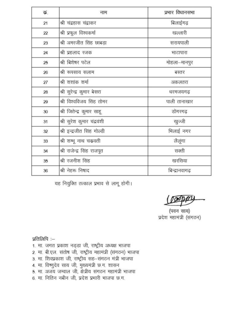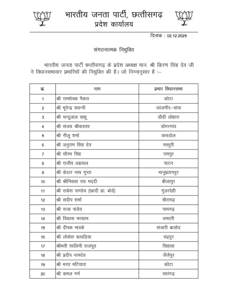 छत्तीसगढ़ : भारतीय जनता पार्टी ने विधानसभा प्रभारियों की टीमों में बड़े फेरबदल के साथ की नियुक्तियाँ