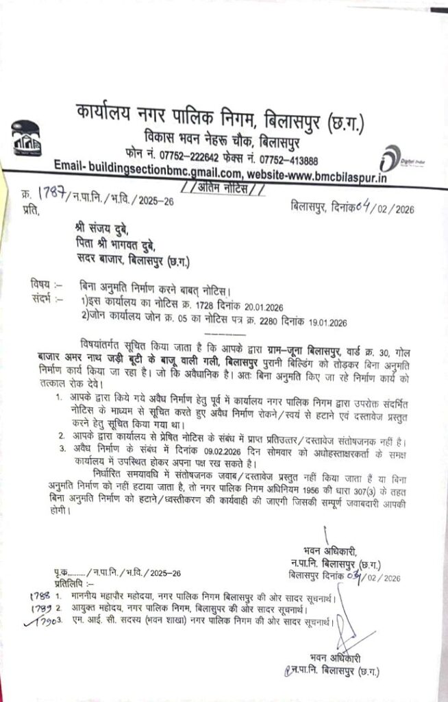 शिकायत के बाद नगर पालिक निगम बिलासपुर के भवन शाखा द्वारा 4 फरवरी 2026 को अतिक्रमणकर्ता संजय दुबे को आधिकारिक नोटिस जारी किया गया। नोटिस में स्पष्ट किया गया है कि—