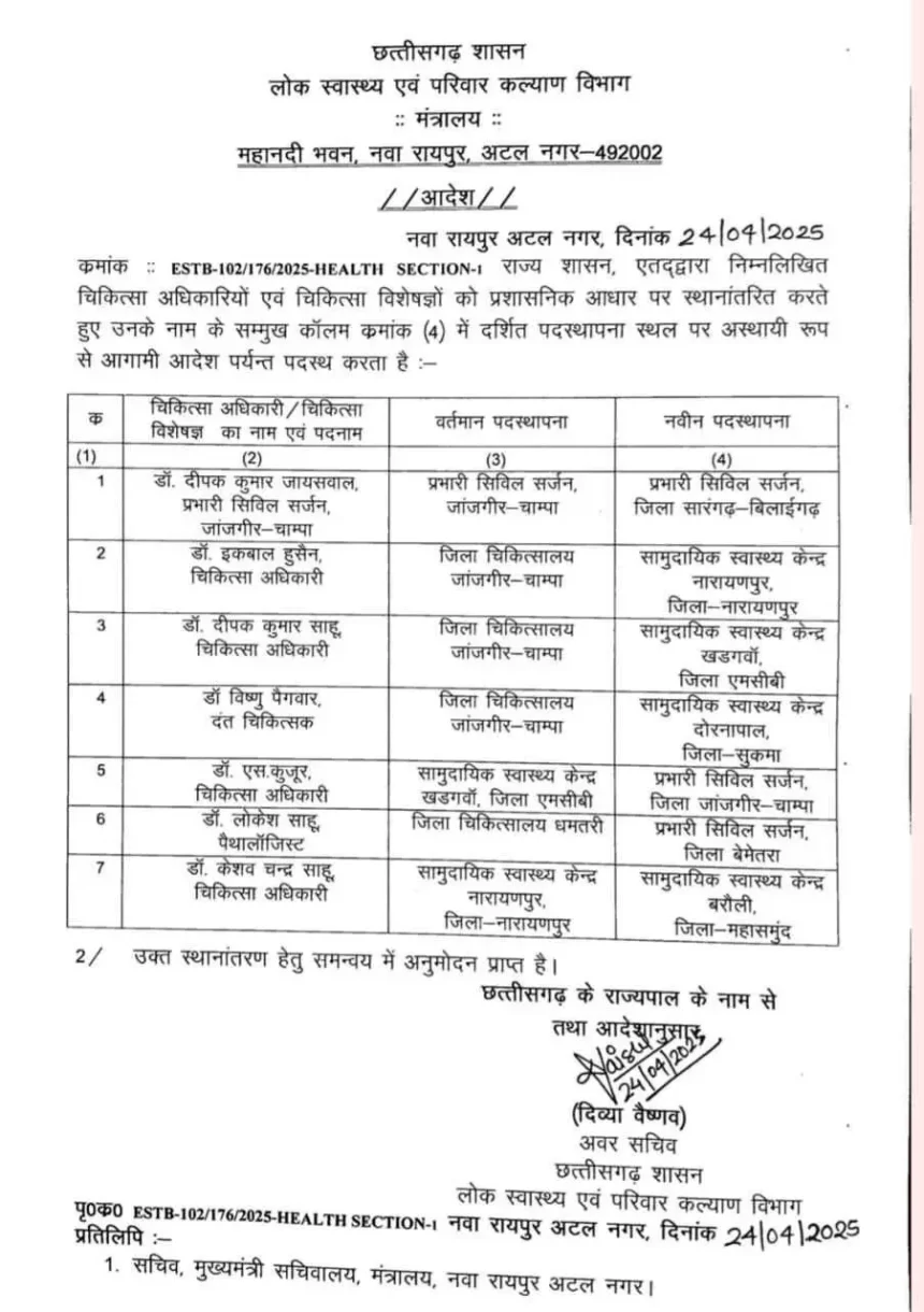 रायपुर: जांजगीर जिला अस्पताल में सिविल सर्जन पर तानाशाही के आरोप, तीन डॉक्टरों का तबादला, स्वास्थ्य विभाग ने जारी किया आदेश